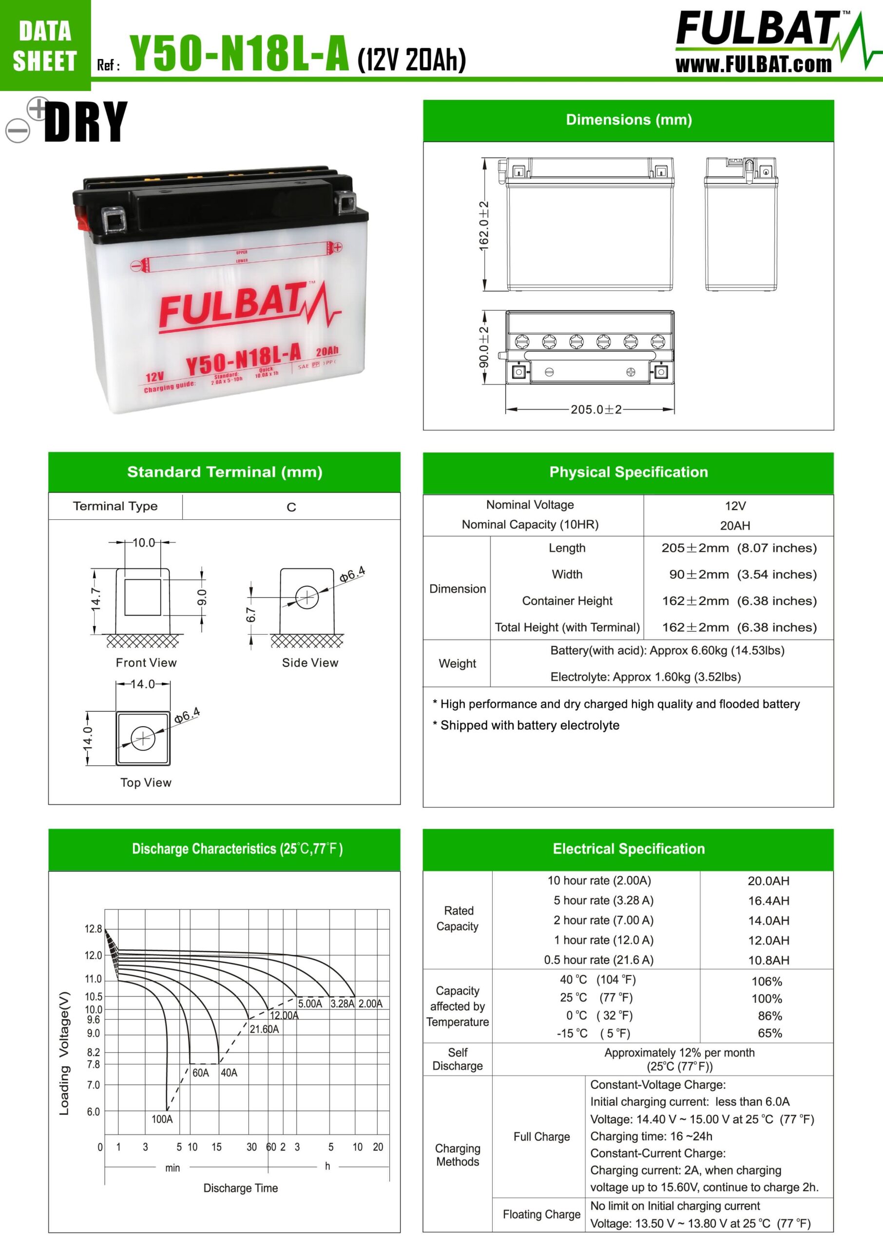 Fulbat F50N18L-A DRY – 12V, 20Ah, 260CCA – Dry-Charged Battery