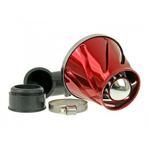 Connection to 28mm and 35mm carburetor connections. Please measure beforehand. Supplied with: 28mm adapter, 90 ° angle connection and mounting bracket. Due to the race-ready air flow, you should increase the main jet by about 7-10%.