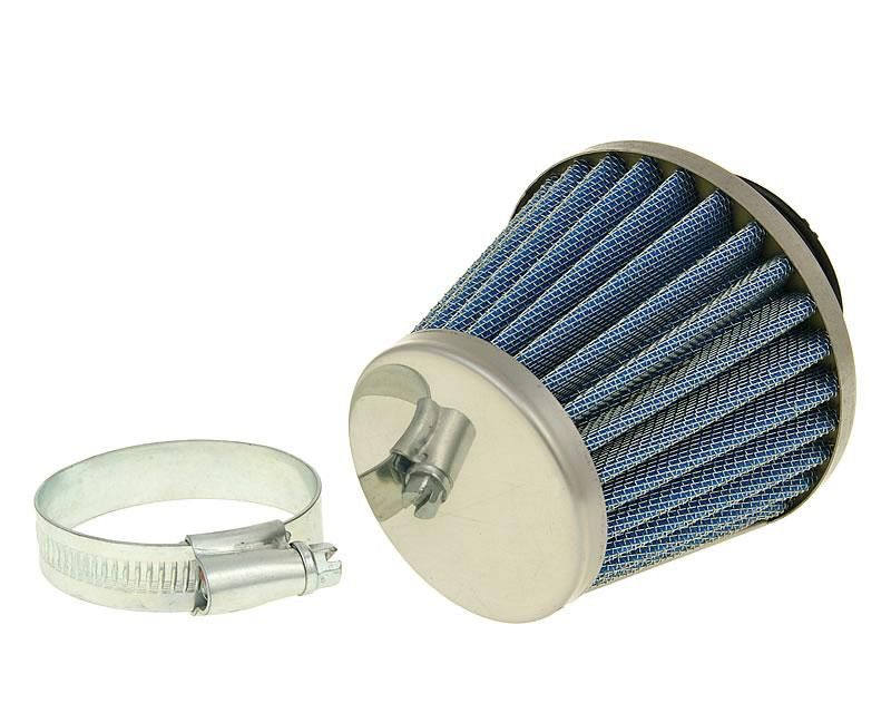 Very low-cost air filter for increased performance and airflow. We offer this filter in various colour styles: blue, red and chrome. The short, straight connector makes installation in tight spaces very easy. 35mm carburettor connection means it fits on nearly all original carbs +/-2mm, on 17.5mm opening Dellorto carbs and Chinese 4-stroke carbs. 35mm Powerfilter, chrome.
