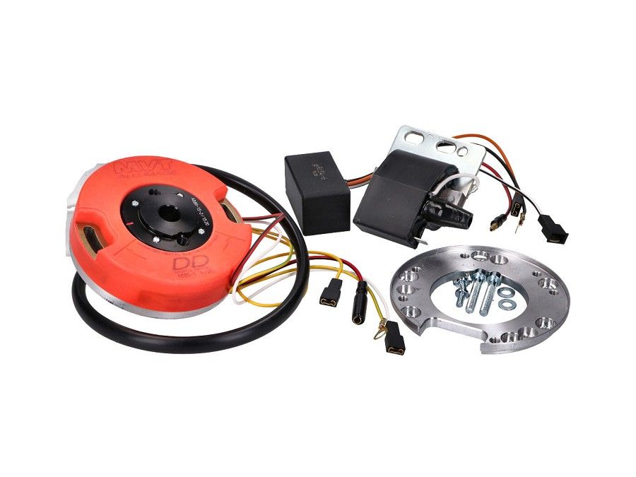 MVT internal rotor ignition DD Digital Direct for Puch Maxi. In contrast to other suppliers of inner rotor ignition systems, which are usually only designed for racing, the Spanish manufacturer MVT has integrated a light/charging coil. This means that this ignition system can completely replace the original ignition and supply the whole on-board electronics with power.Thanks to the light weight inner rotor the engine is much more agile, hangs much better on the gas and the idle gas is very stable. A light weight inner rotor is much superior to the heavy original rotor in a 2-stroke engine and delivers best performance with absolute reliability and suitability for everyday use. The DD Digital Direct internal rotor ignition has a digital CDI with adaptive ignition timing adjustment and is therefore ideally suited for tuned engines. Power: 60W Ignition voltage: 42kV Max. rev speed: 22.000rpm