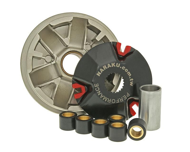 NARAKU sports variator for Morini engines. When calibrated, this variator provides good acceleration at higher top speeds. The restriction of the original variator is lifted giving a greater top end. The set comes with 8g Variator weights 16x13mm. These weights are suitable for scooters in original condition. If tuning components (e.g. exhaust system or counter pressure spring) are installed, we recommend that you re-calibrate the weights. We offer various kits and 16×13 weights.