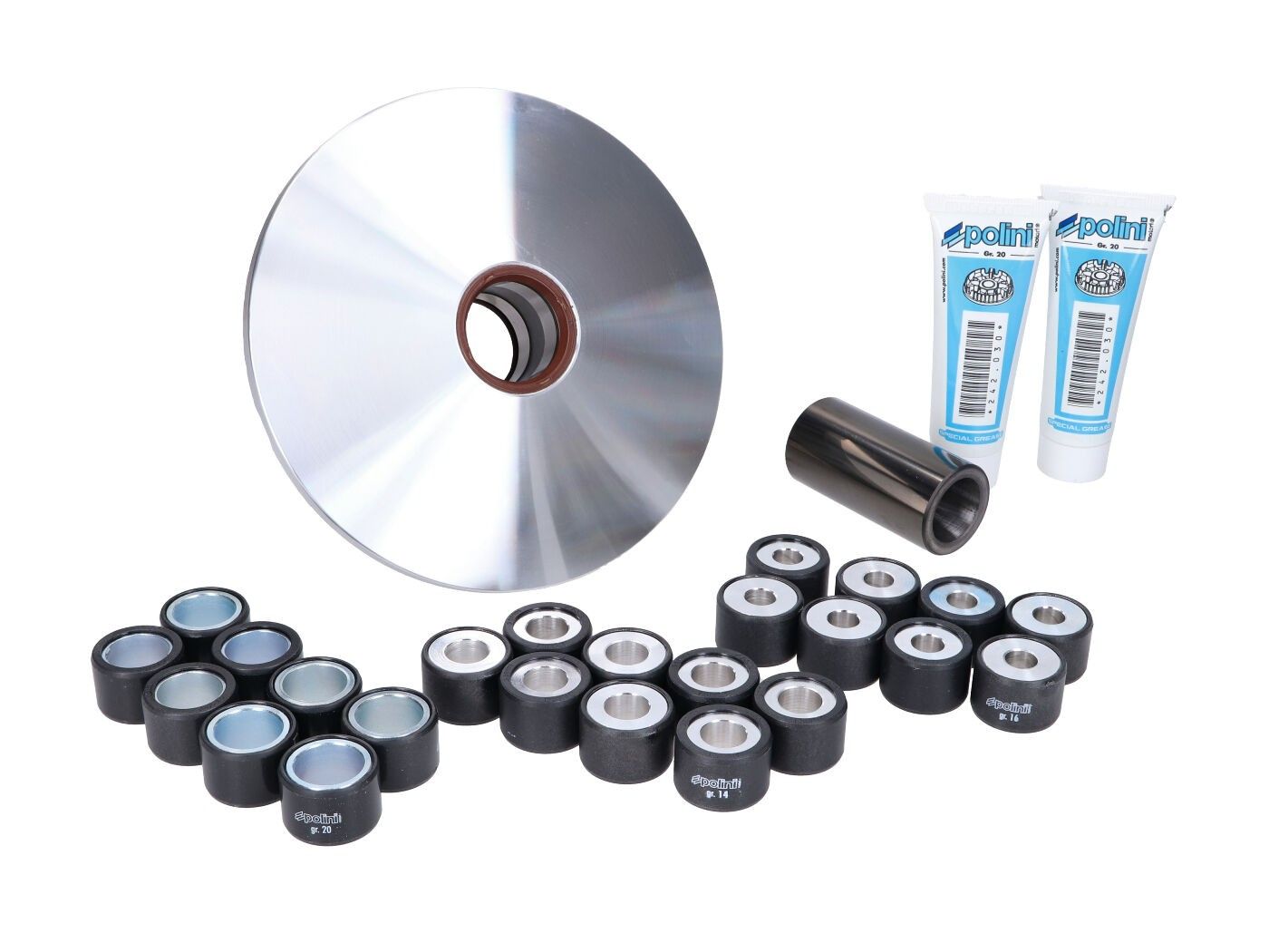 The Polini Maxi Hi-Speed is one of the strongest variators in maxi scooter range. The emphasis was placed on the construction of the roller tracks, which optimally exploit the available power band of the engine resulting in better acceleration and a little more top speed.Supplied as shown with instructions included.