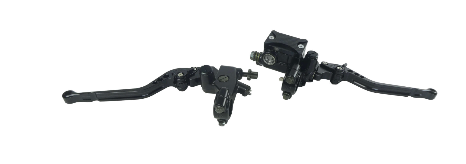 Stylish and sporty CNC aluminium lever set in matte black, designed for vehicles with manual front disc brake control and clutch or rear drum brake operation. Precisely machined aluminium provides excellent feel, responsiveness, and durability. This set is perfect for riders who want a blend of appearance, quality, and precise control.