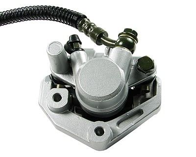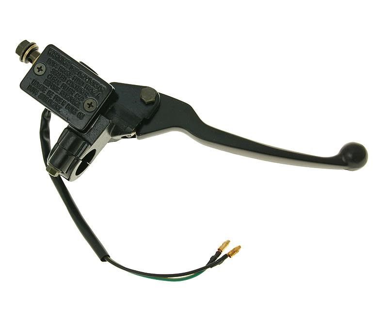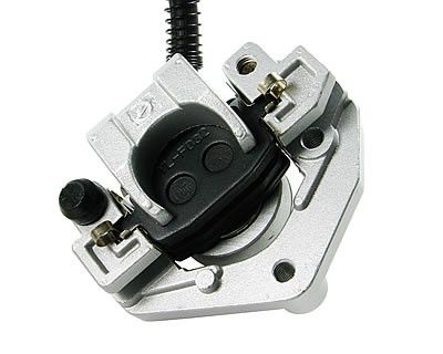 This brake system consists of a hand brake cylinder (hand brake pump) with lever, hose, calliper with pads and brake light switch. The brake system is suitable for all scooters with 10” wheels. It can be that the brake light switch connector must be slightly adapted if a different connector is fitted. No mirror fitment. Brake hose length: 95cm.